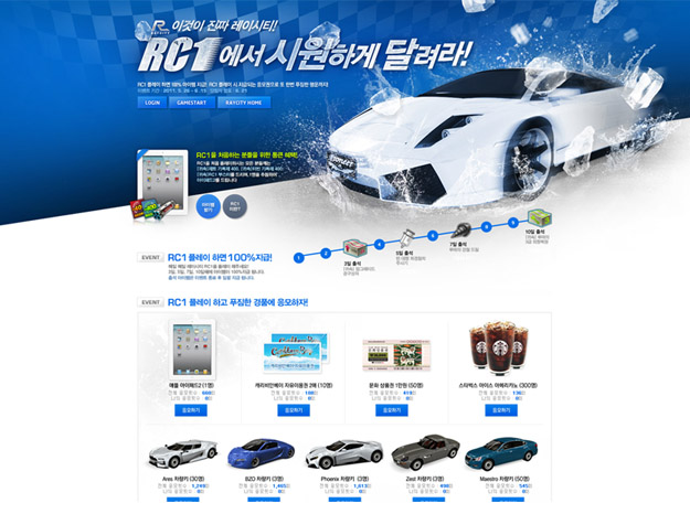 上圖,將背景旋轉后,大面積的斜面產生了很強的速度感,賽車急速飛馳著,好像下一秒就要從電腦中沖出來一樣,傾斜的大標題和旋轉后的背景交叉配合,使畫面整個都運動起來。這種方法可以應用到很多運動的主題上。