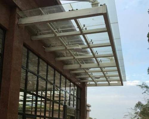 玻璃雨棚介紹玻璃雨棚是以鋼結構框架為主要結構,選用優質Q235材質的系列鋼管,包括鋼柱、鋼主梁次梁等。