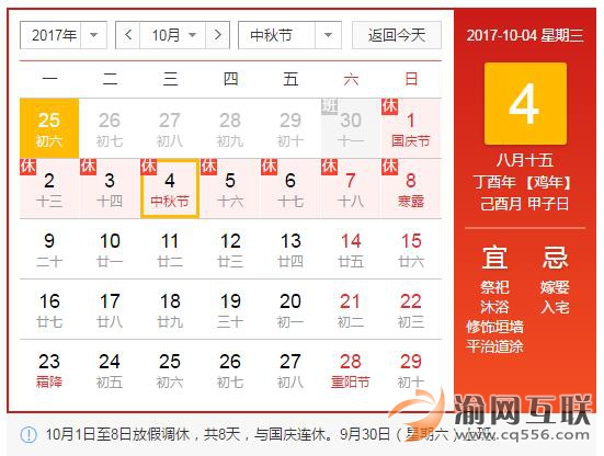 2017年中秋節(jié)、國慶節(jié)放假安排:9月30日(星期六)上班。10月1日至8日放假調(diào)休,共8天。10月9日正常上班。
