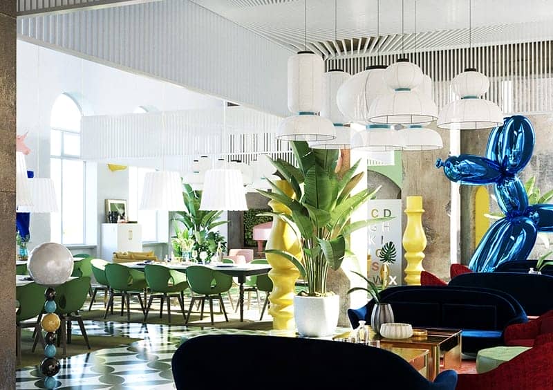 以綠色為主體,穿插不同材質(zhì)不用純度的,紅色,黃色 ,藍(lán)色。空間里混搭了比較多的元素。