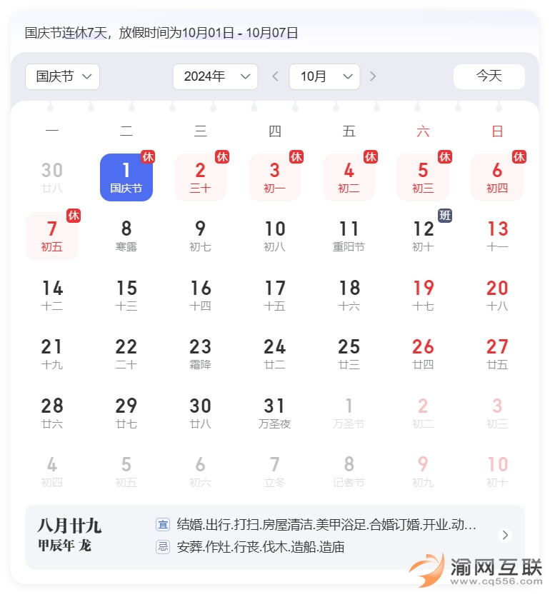 根據(jù)《國(guó)務(wù)院辦公廳關(guān)于2024年部分節(jié)假日安排的通知》,10月1日至10月7日,國(guó)慶節(jié)放假調(diào)休共7天,9月29日(星期日)和10月12日(星期六)上班 。