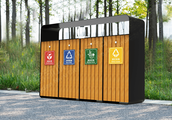 木紋四分類垃圾桶,木紋區別于金屬材料緊張過度的硬質感,給人溫熱、柔和的感覺,布滿了生命的張力。讓人覺得與自然只有咫尺之遠。接受客戶尺寸顏色定制,歡迎咨詢。