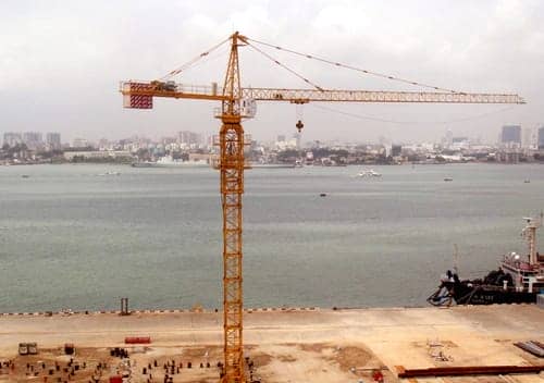 塔吊起重機是動臂裝在高聳塔身上部的旋轉起重機。工作范圍大,主要用于多層和高層建筑施工中材料的垂直運輸和構件安裝。由金屬結構,工作機構和電氣系統三部分組成。金屬結構包括塔身、動臂、底座、附著桿等。工作機構有起升、變幅、歸轉和行走四部分。電氣系統包括電動機、控制器、配電框、聯連線路、信號及照明裝置等。塔吊起重機分上旋轉式和下旋轉式兩類:一、上旋轉式塔吊起重機:塔身不轉動,歸轉支承以上的動臂、平衡臂等,通過歸轉機構繞塔身中央線作全歸轉。根據使用要求,又分運行式、固定式、附著式和內爬式。運行式塔吊起重機可沿軌道運行,工作范圍大,應用廣泛,宜用于多層建筑施工;如將起重機底座固定在軌道上或將塔身直接固定在基礎上就成為固定式塔吊起重機,其動臂較長;如在固定式塔吊起重機塔身上每隔一定高度用附著桿與建筑物相連,即為附著式塔吊起重機,它采用塔身接高裝置使起重機上部歸轉部分可隨建筑物增高而相應增高,用于高層建筑施工;將起重機安設在電梯井等井筒或連通的孔洞內,利用液壓缸使起重機根據施工入程沿井筒向上爬升者稱為內爬式塔吊起重機,它節省了部分塔身、服務范圍大、不占用施工場地,但對建筑物的結構有一定要求。